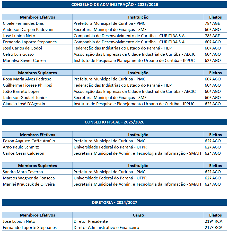 O Conselho de Administração é um órgão de deliberação colegiada, responsável pela orientação geral da administração da Companhia de Desenvolvimento de Curitiba – CURITIBA S.A, incluindo suas ações de longo prazo. É responsável, também, dentre outras atribuições, pela eleição da Diretoria Executiva da Companhia, bem como fiscalização da respectiva gestão.